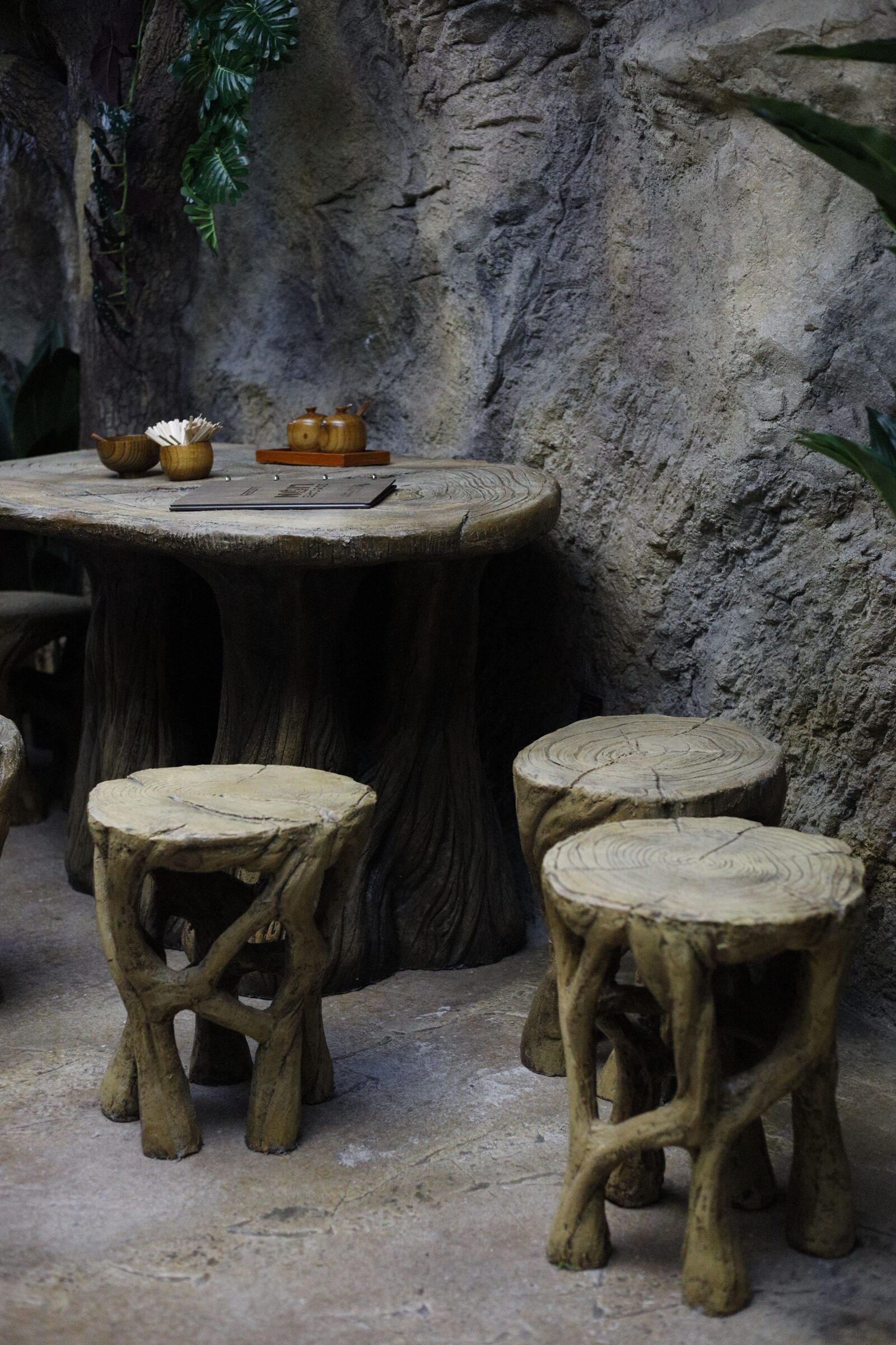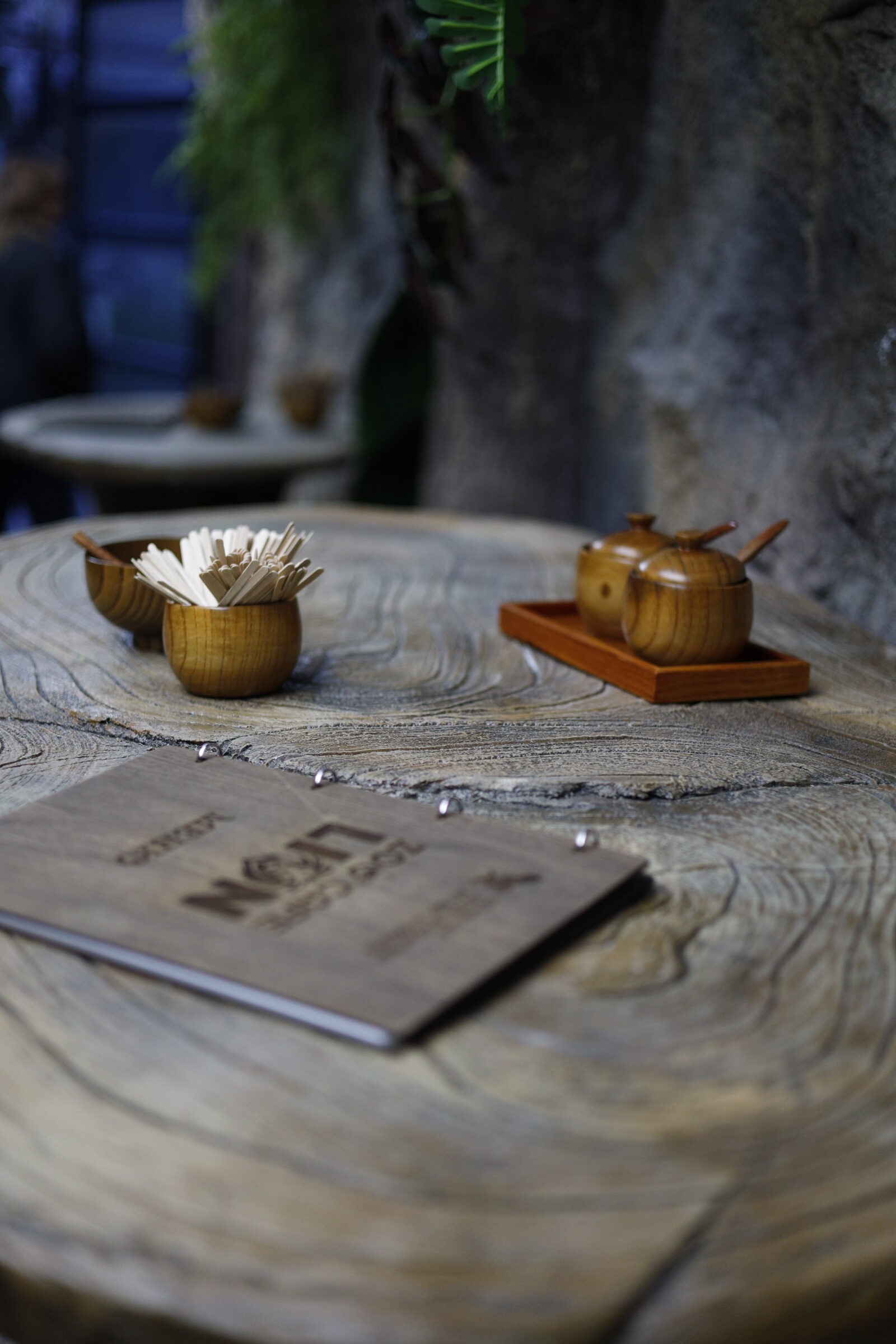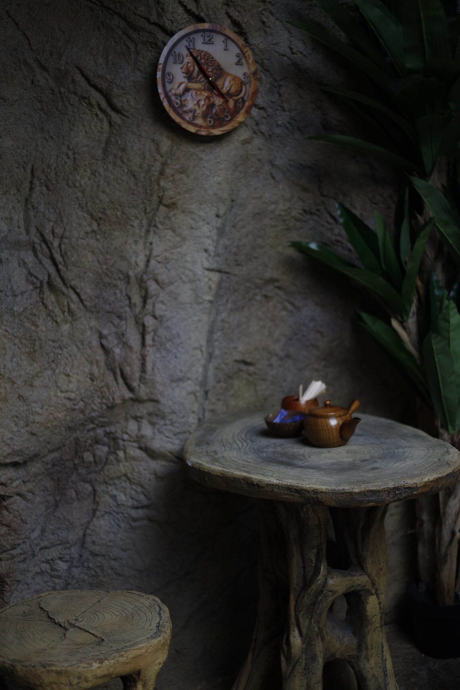Интериорът на Zoo Cafe LION е истинско попадение – дървен, топъл, природно вдъхновен. Столчета от пънчета, декоративни клони, дървени чашки и акценти, които имитират горска среда, създават уют и автентичност. Сякаш за миг се пренасяш в лагер сред саваната. А! Да не пропуснем и друг впечатляващ детайл – осветлението е скрито зад „небесен“ таван.
