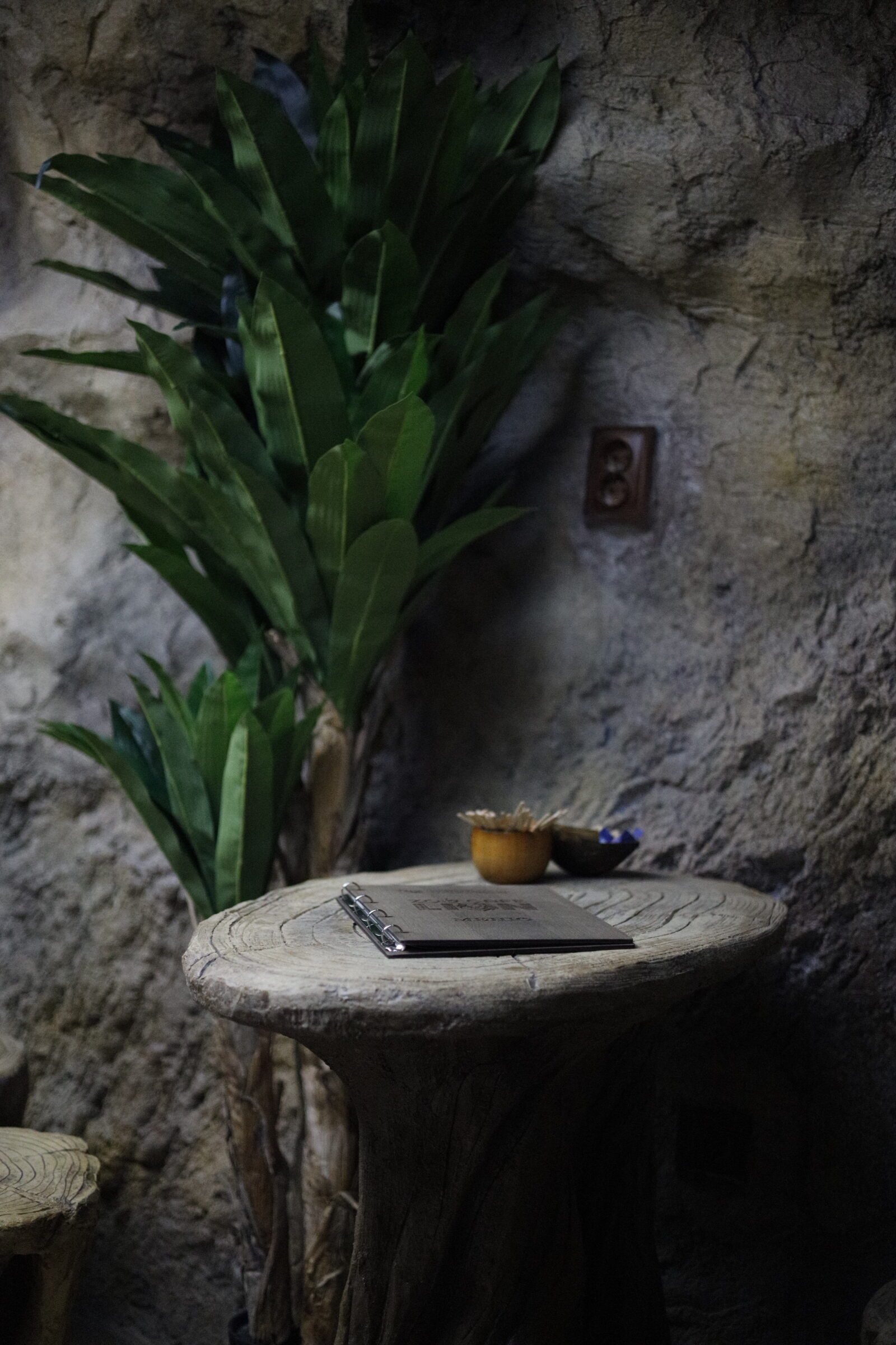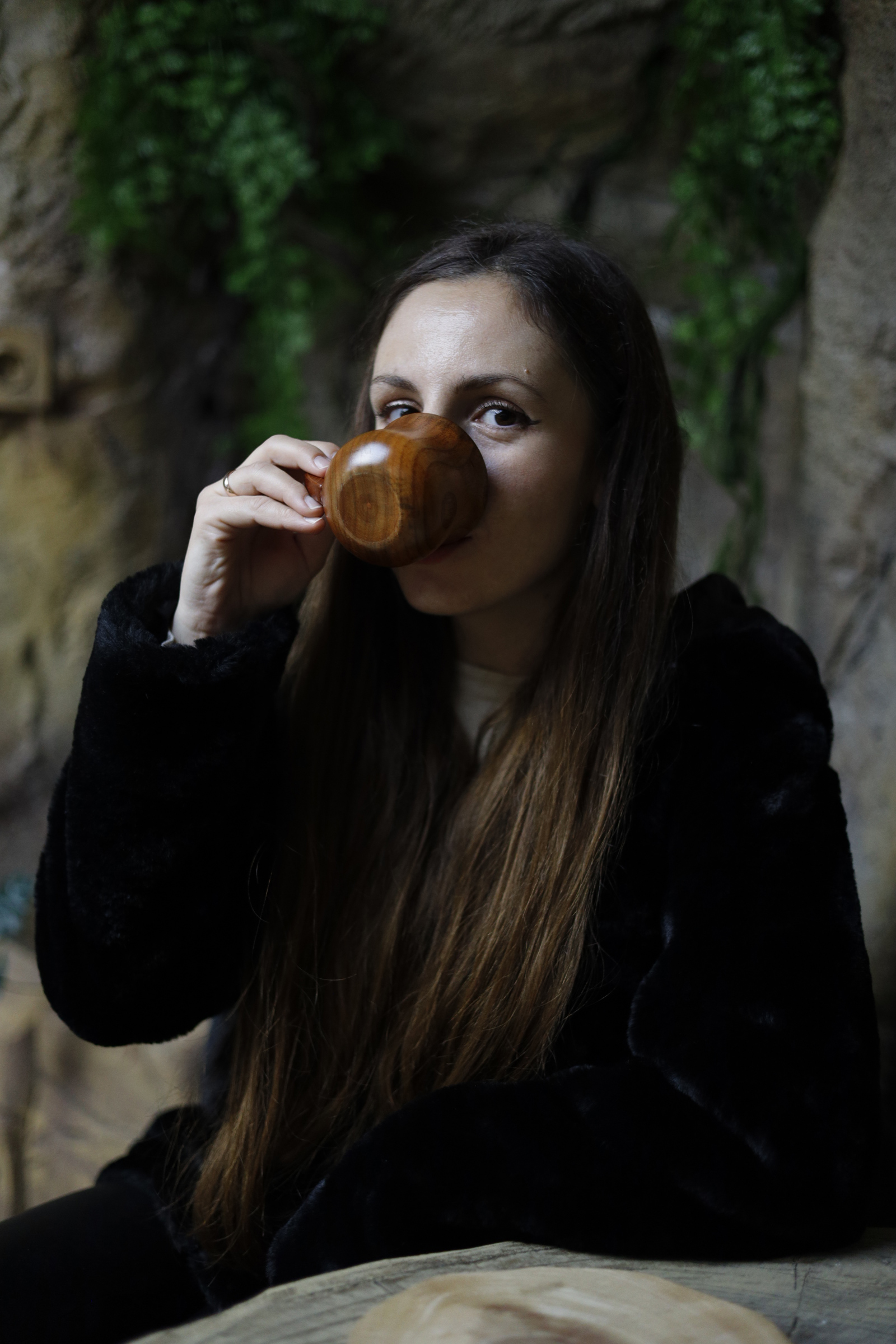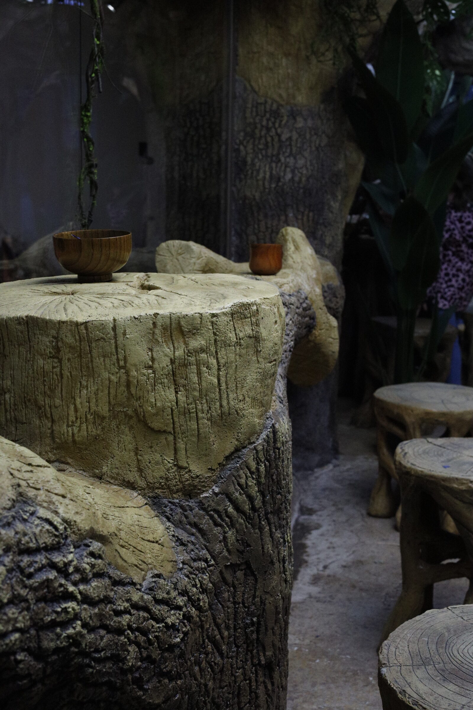 Интериорът на Zoo Cafe LION е истинско попадение – дървен, топъл, природно вдъхновен. Столчета от пънчета, декоративни клони, дървени чашки и акценти, които имитират горска среда, създават уют и автентичност. Сякаш за миг се пренасяш в лагер сред саваната. А! Да не пропуснем и друг впечатляващ детайл – осветлението е скрито зад „небесен“ таван.