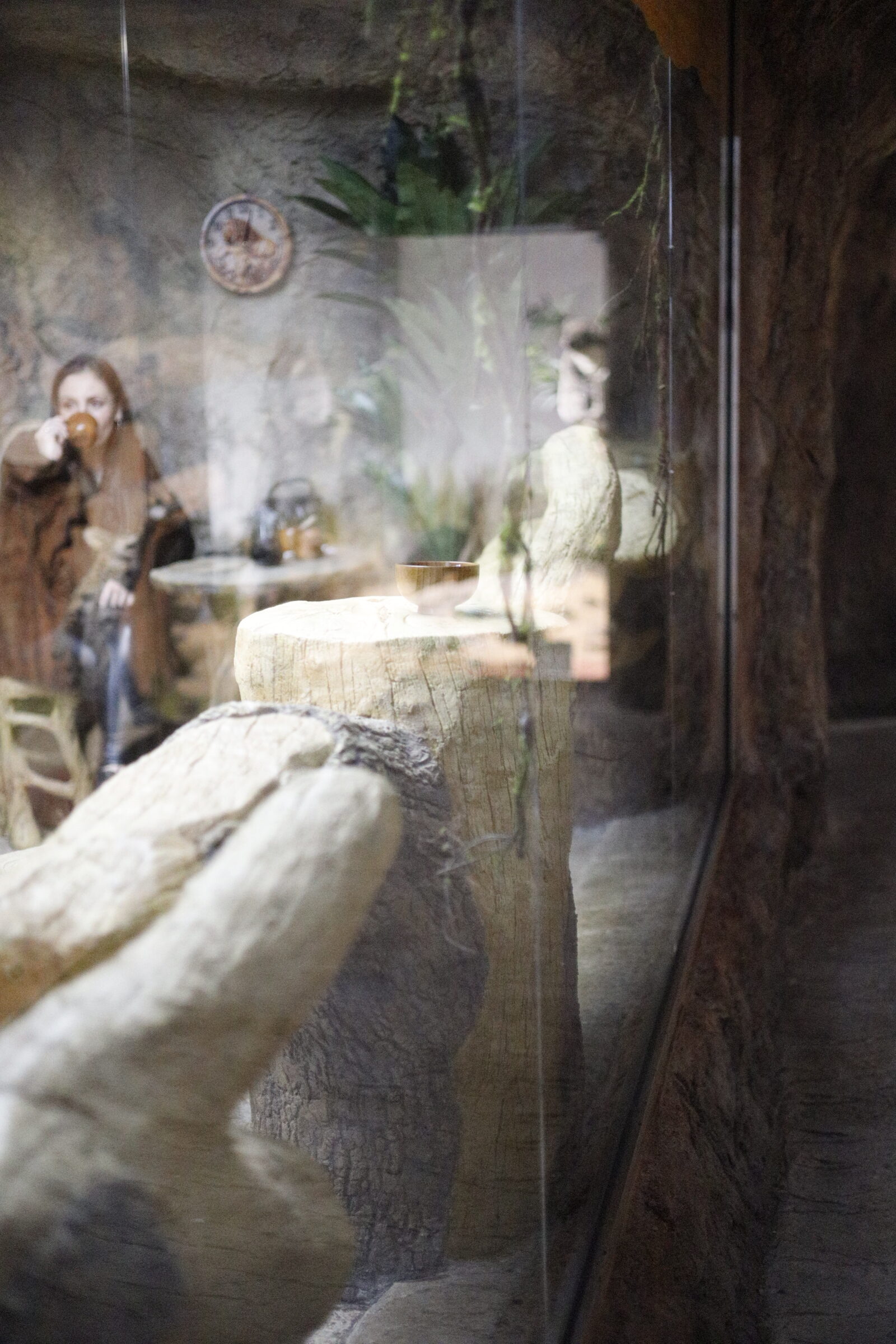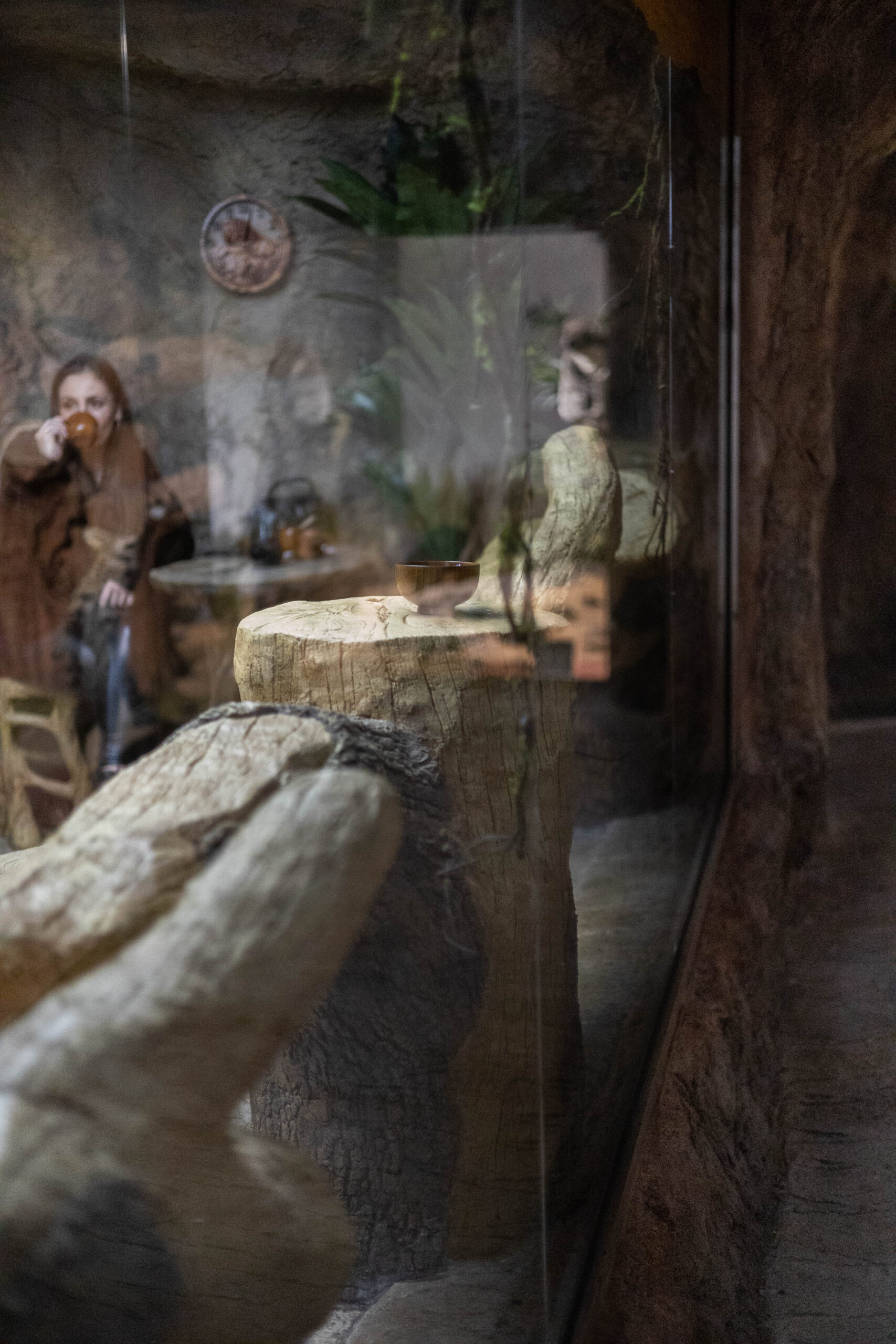 Кафенето и експозицията са две отделни зали, разделени от стъклена стена (витрина) и коридор между тях. Именно тази архитектурна връзка позволява на посетителя едновременно да се наслаждава на кафето си и да усеща атмосферата на дивата природа, без да се смесват пространствата.